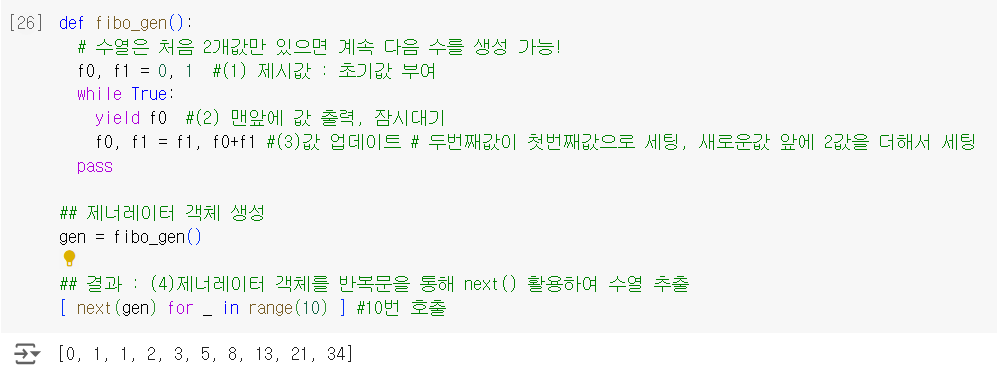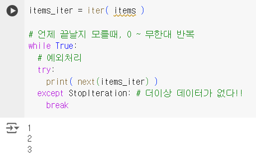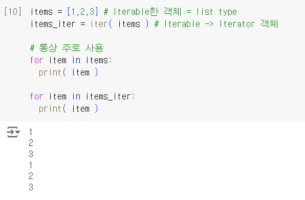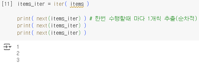 값을 차례대로 꺼낼수 있는 객체제어가능내장함수/맴버(내부)함수를 이용해 Iterator 객체 획득 가능 : 상호연결성(+)next() 사용while문에서 유용🔸EX.01-A > 결과값 동일