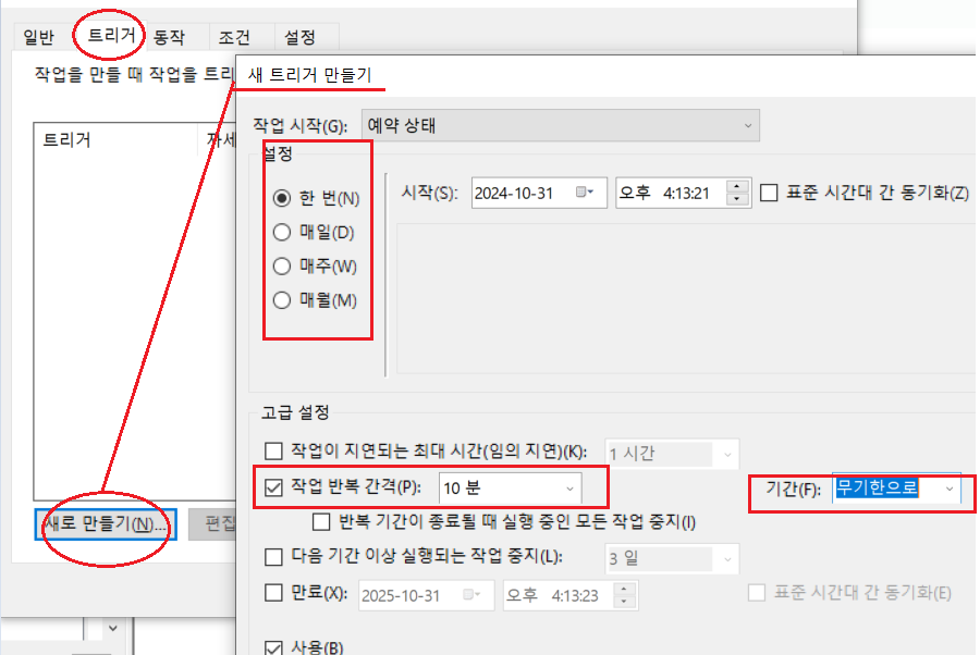 -이름, 설명- 트리거 (= 작업동작 시간 설정)