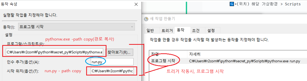 -재료: 작업 디렉토리, 파이썬 파일명, python.exe|pythonw.exe