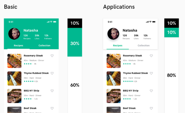 60%와 30%를 이용하여 배갱색을 배분하고, 강조하거나 글 위주의 서비스일 경우 10%로만 사용한다