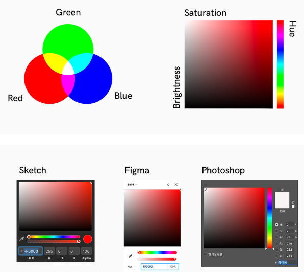 디지털 프로덕트에서 색은 주로 RGB, HSL, HSB 등이 있고, 작업 시에는 HEX와 RGB를 사용한다.