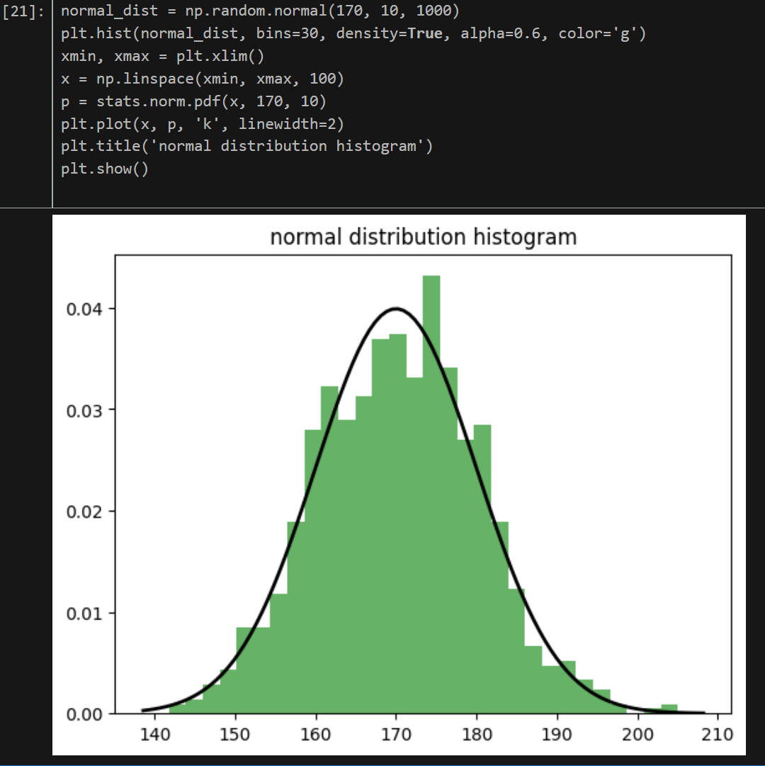 loc(float): 정규 분포의 평균 (기본값: 0.0)scale (float): 정규분포의 표준편차 (기본값: 1.0)size (int 또는 tuple of ints): 출력 배열의 크기 (기본값: None. 즉, 스칼라 값 반환)코드 설명: