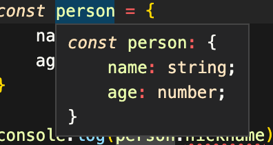 타입스크립트는 person 을 단순히 object 타입을 지정하지않고 안에 정의된 property 의 타입까지 추론하여 정의한다.