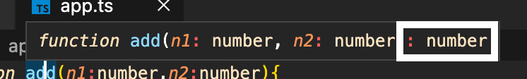 함수의 마우스를 올려보면 :{type} 이 나오는데 리턴값의 타입이다. 여기서는 두 개의 숫자타입 인자를 더해서 리턴했기 때문에 타입스크립트가 자동으로 리턴값을 숫자로 인식했다.