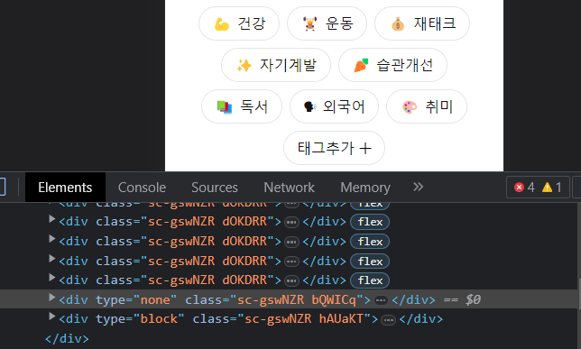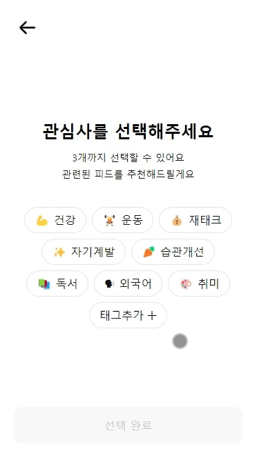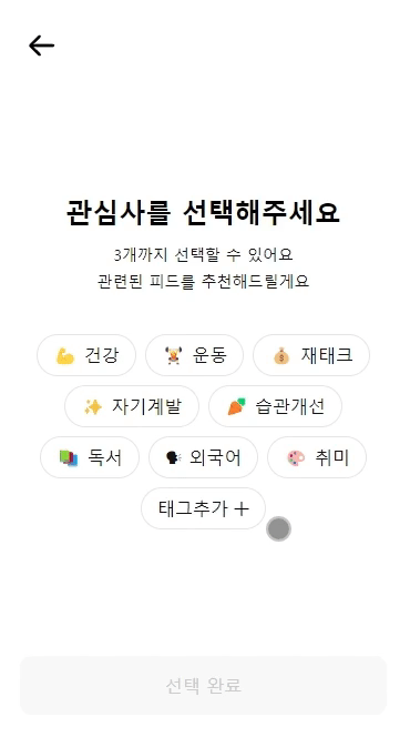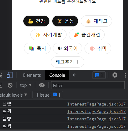 관심사 태그를 선택하는 페이지에서, 사용자가 직접 태그를 작성해서 추가하는 기능을 구현하였다. '태그 추가' 버튼을 누르면 태그 내용을 작성할 수 있는 input이 등장한다.