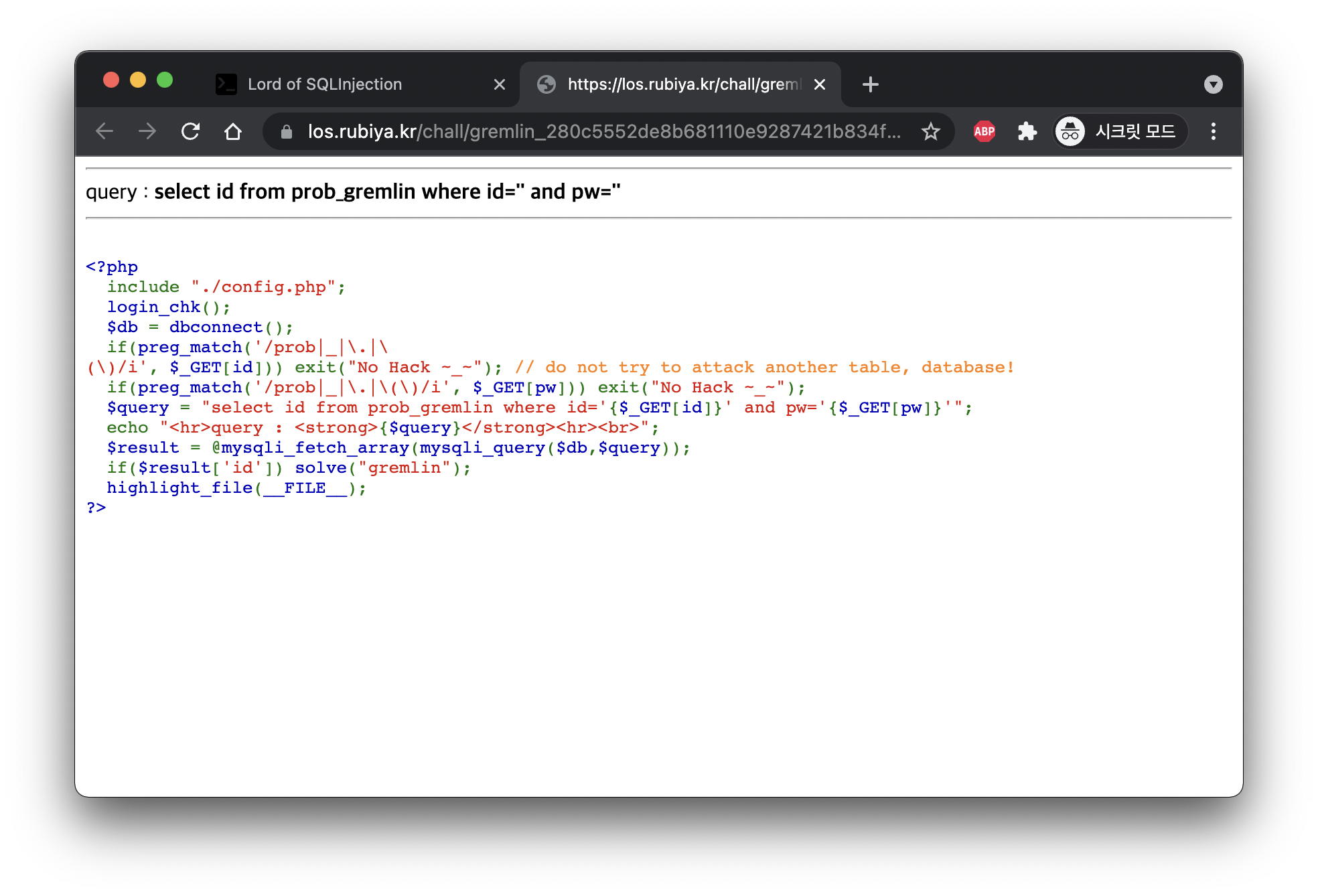 "select id from prob_gremlin where id=’{$_GET[id]}’ and pw=’{$_GET[pw]}’”;