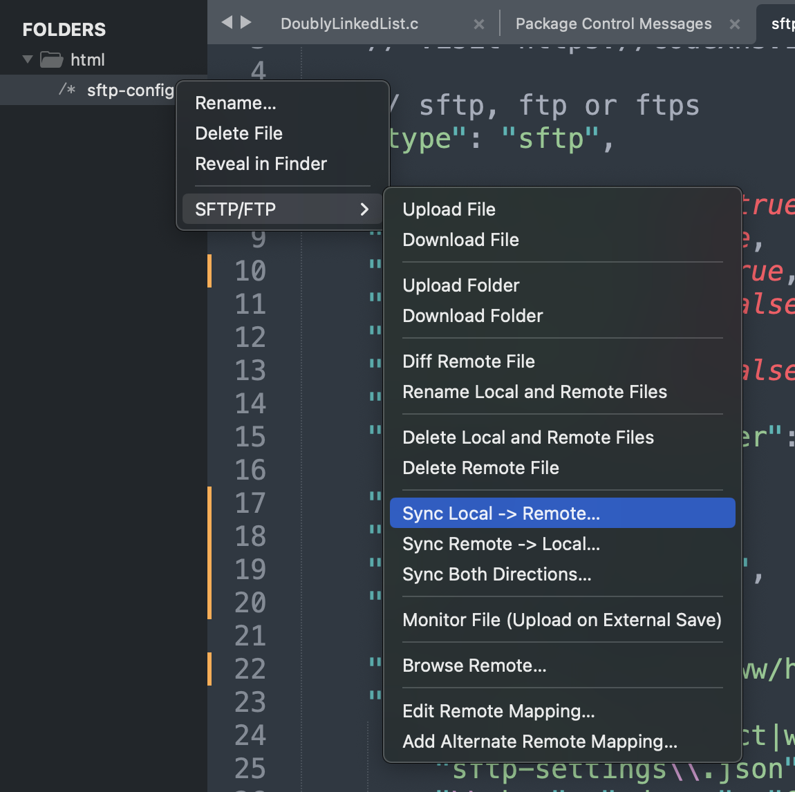 설정이 끝나면 [우클릭] - [SFTP/FTP] - [Sync Local->Remote...]를 눌러 업로드할 수 있습니다.