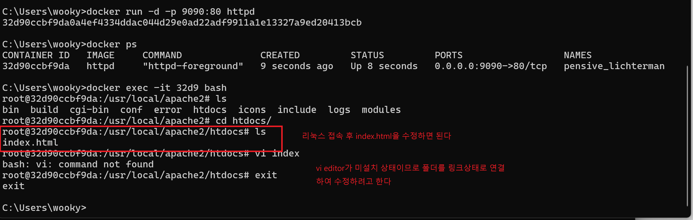 httpd 서버를 구동하면 httpd 서버의 index.html이 렌더링된다. 도커 볼륨을 이용해 공유 폴더를 만들어 httpd 서버의 index.html을 직접 만든 index.html로 바꾸려고 한다.