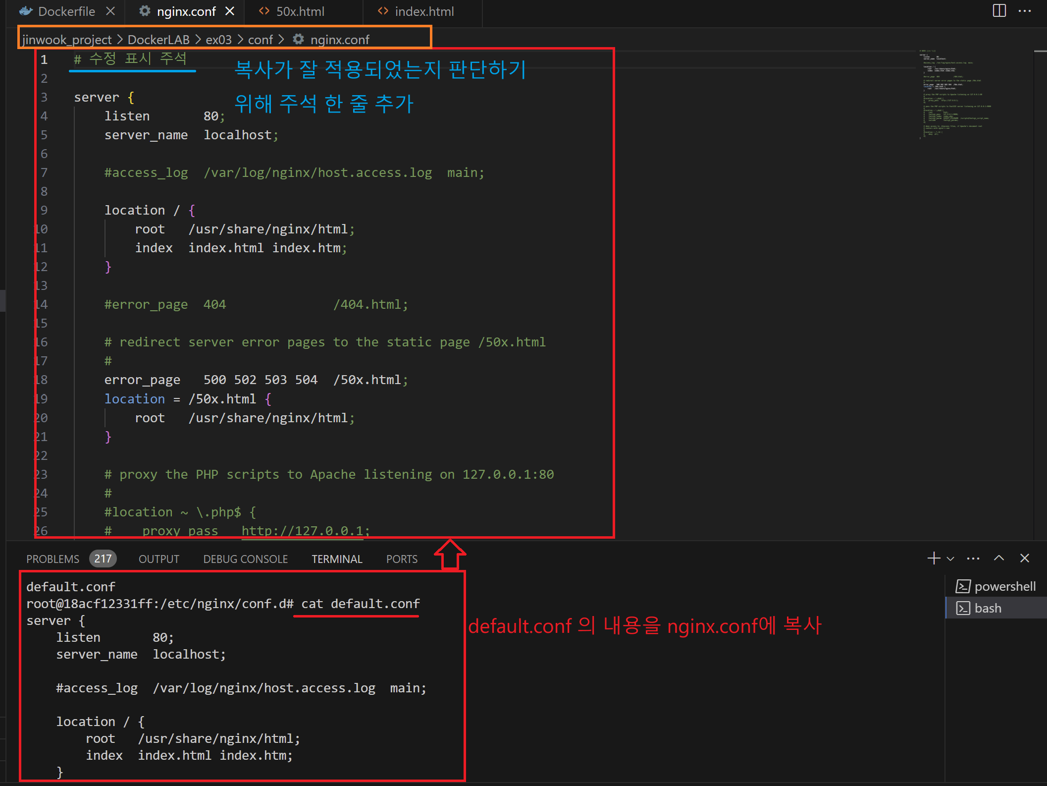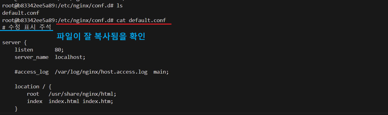 default.conf의 내용을 ex03의 nginx.conf에 복사하였고 복사한 파일을 구분 짓기 위해 주석 한 줄을 추가하였다.