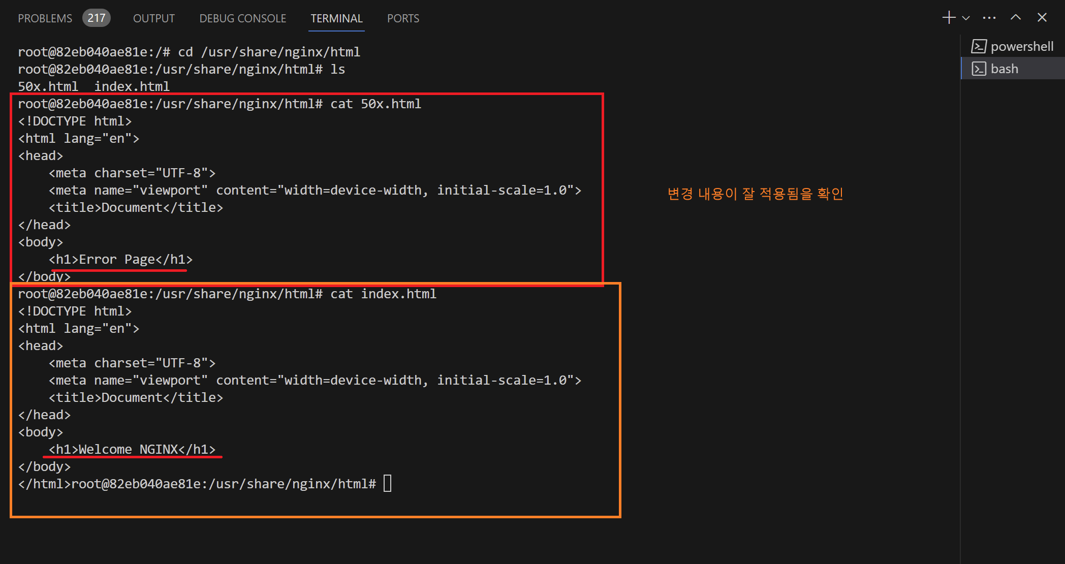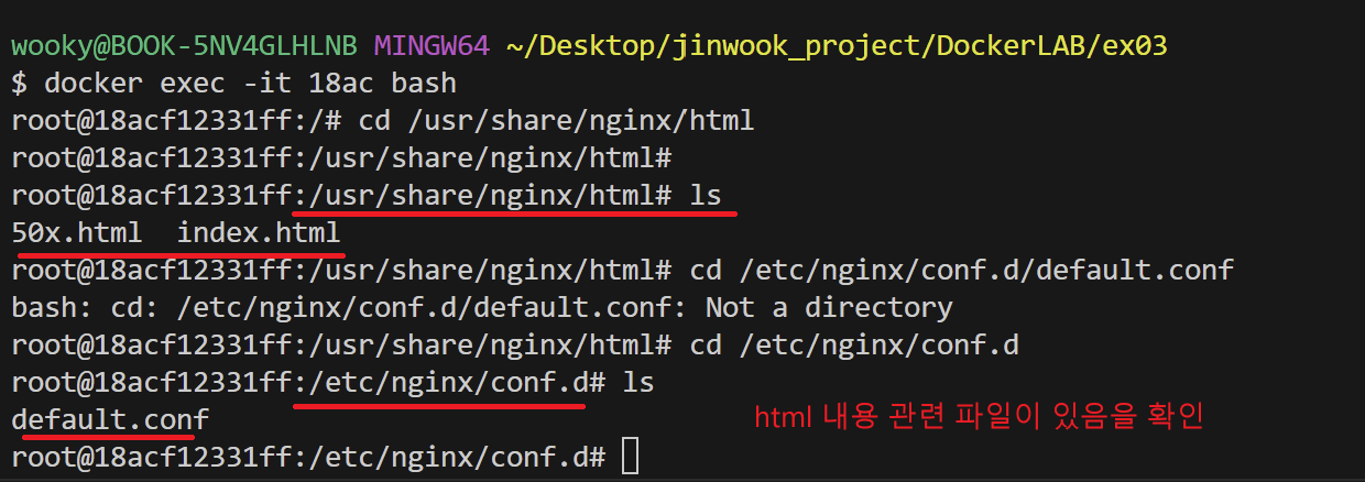/usr/share/nginx/html에 50x.html,index.html 있는 것 확인/etc/nginx/conf.d에 default.conf 있는 것 확인