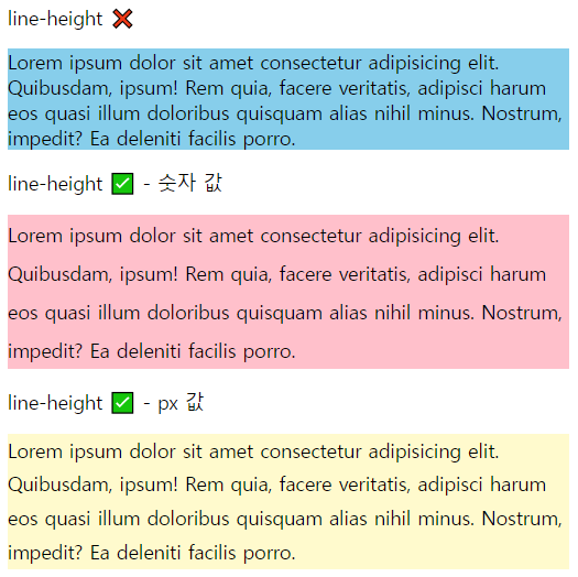 여기서 단위 없는 수사 값은 해당 요소의 font-size를 기준 한 배수로 높이를 조정합니다. 또한 line-height는 line 사이의 height가 아닌 말 그대로 line의 height를 뜻합니다.