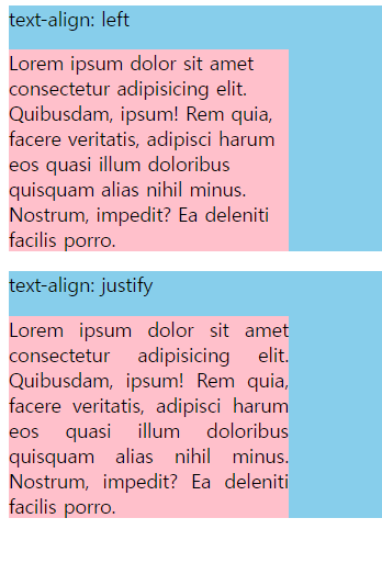 justity라는 값은 좌우로 띄어쓰기를 늘려 붙입니다. 신문기사나 잡지 등에서 볼 수 있는 형식입니다.