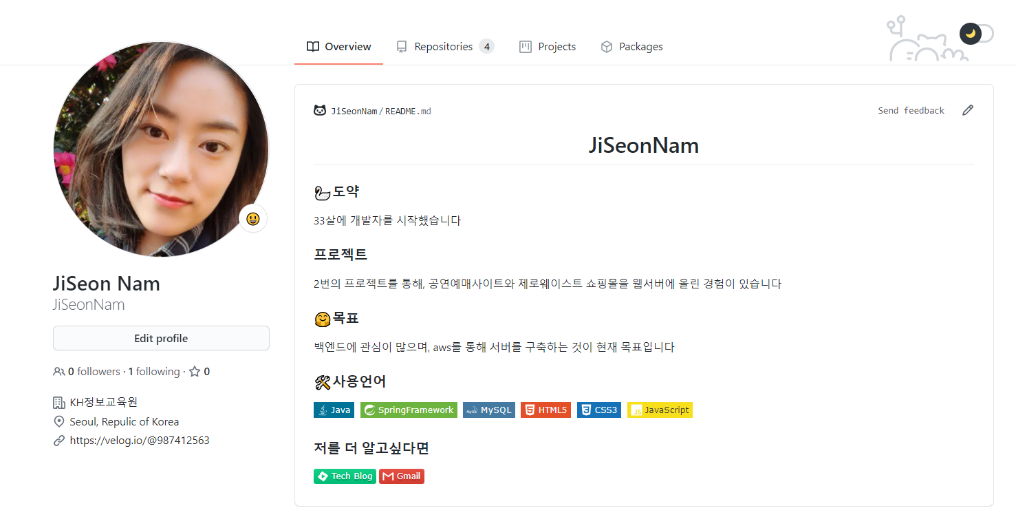 참고 블로그를 통해 2시간동안 만든 프로필이다.