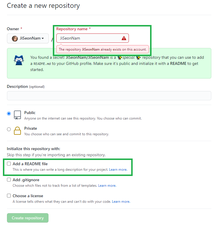Public으로 해준뒤, Add a README file을 체크하면 된다.