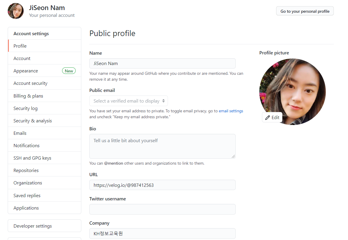 email, Bio로 간단 설명, URL로 블로그, Company는 내가 다녔던 학원, Location은 활동반경을 간단하게 넣어 표현했다.