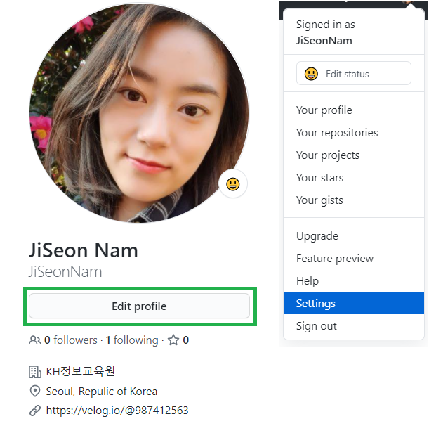 왼쪽화면에서 Edit profile을 누르면 간단하게 편집이 가능하다. 또는 오른쪽 상단의 프로필을 누르면 나오는 Settings를 눌러도 편집이 가능하다.