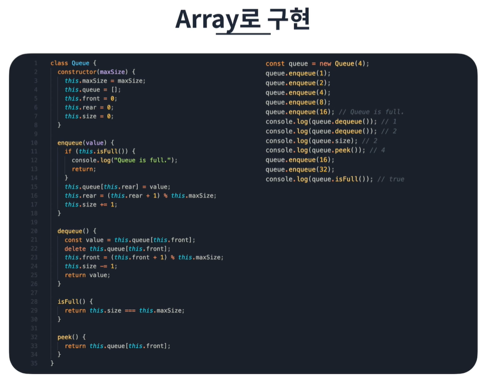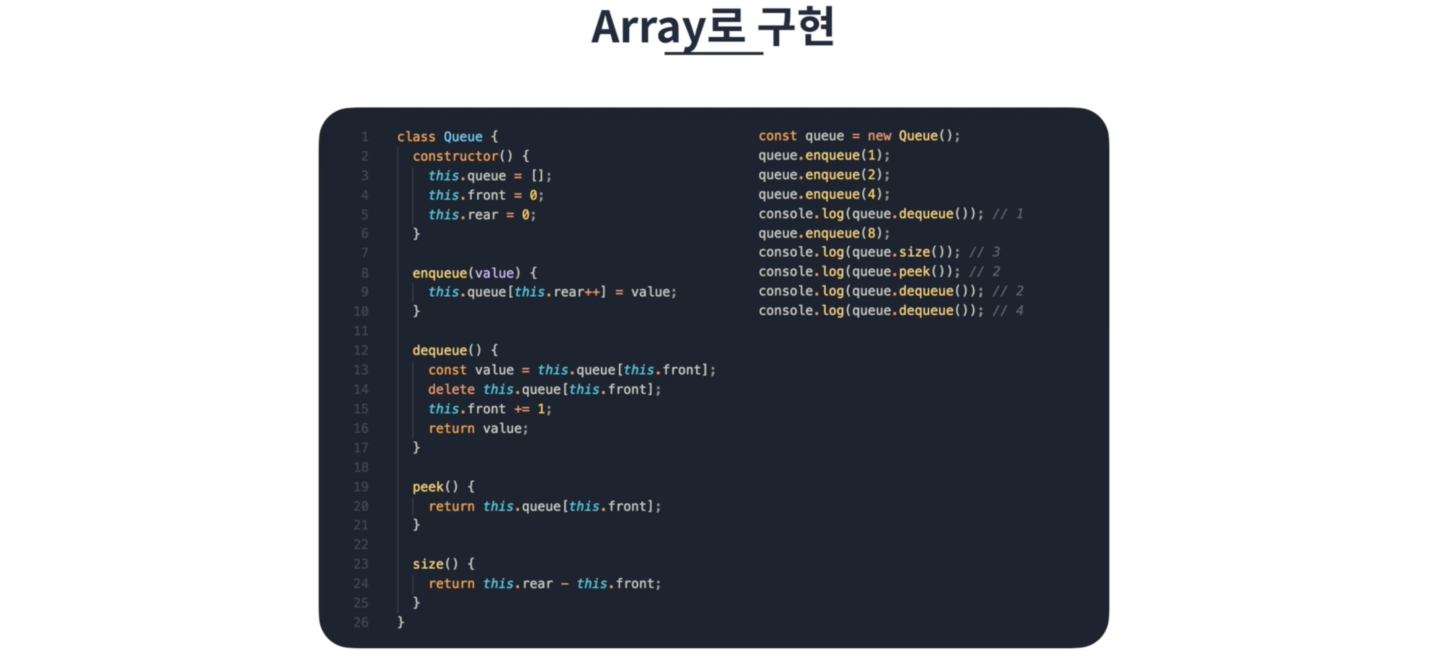 js는 배열 증감이 유동적이라 배열이 꽉 차진 않지만, 빈 공간이 있으면 프론트 & 리어 인덱스 값이 무한정 커짐 -> 빈 공간을 앞당기면 선형시간 소요됨 ㅠㅠ