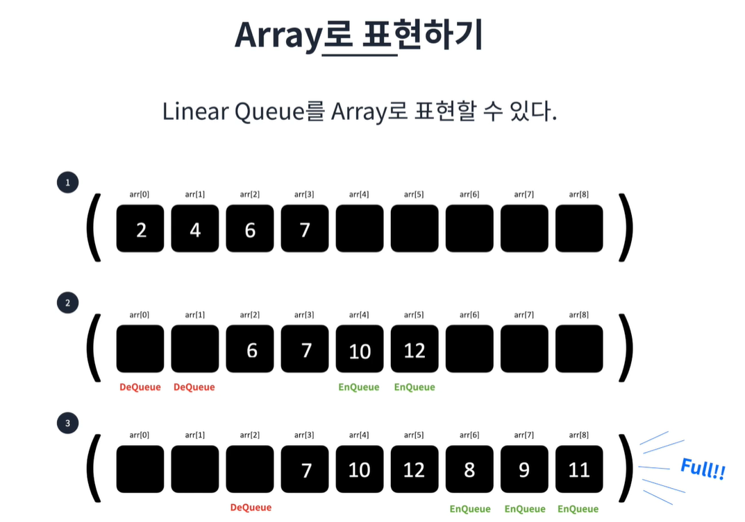 - 배열: 앞에서부터 뒤로 계속 추가하면 됨 (뺄 때는 앞에서부터 빼지만 빈 공간은 생김)