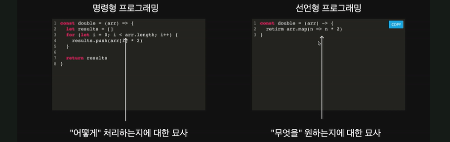 map함수를 사용해 현재 배열을 이용해 새 배열 만들 것을 명시, n => n * 2를 이용해 원하는 목적을 명시 (사용자가 목적 이해를 빨리 할 수 있음)명령형 프로그래밍은 조건이 생기면 하나하나 적어야함 -> 양파처럼 계속 큰 함수 안에 쌓임