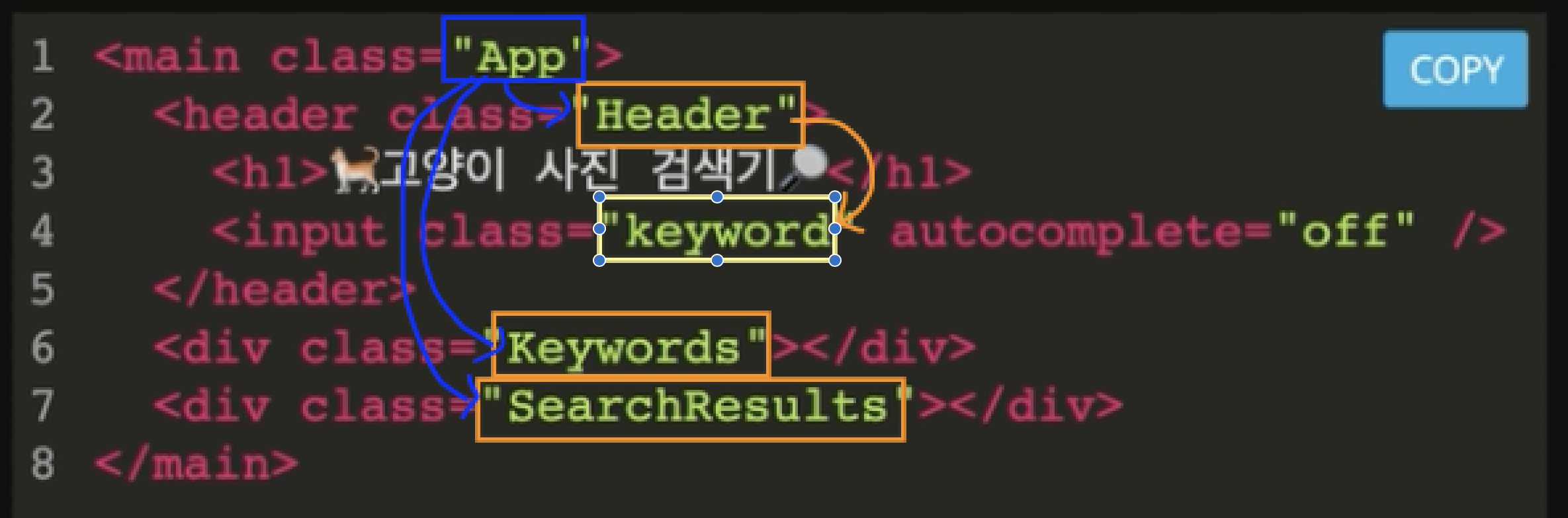 App에서Keywords에 내려서 화면에 그림Keywords에서 선택된 값을App이 받음 ->App이SearchResults로 내려서 얘가 화면에 그림