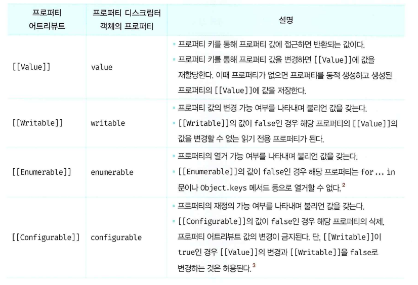 자바스크립트 엔진은 프로퍼티를 생성할 때 프로퍼티의 상태를 나타내는 프로퍼티 어트리뷰트를 기본값으로 자동 정의함