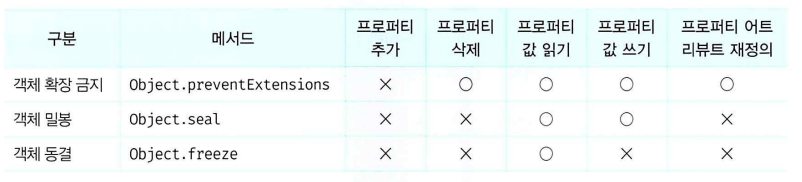 : 프로퍼티 추가 및 삭제와 프로퍼티 어트리뷰트 재정의 금지, 프로퍼티 값 갱신 금지 -> 읽기만 가능Object.isFrozen 메서드