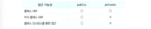 public 필드는 어디서든 참조할 수 있지만 private 필드는 클래스 내부에서만 참조할 수 있음