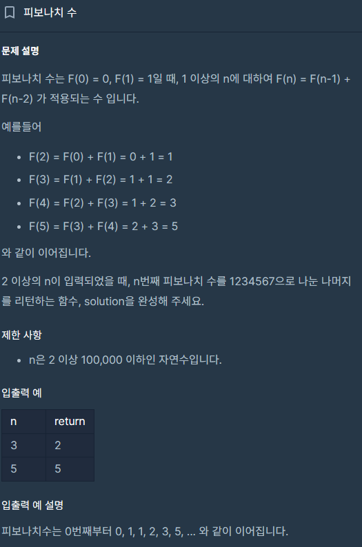 문제에서 요구하는 것이 피보나치 수가 아니라 피보나치 수를 %1234567로 나누고 남은 값인 이유는 더 빠르게 연산하고 정수의 오버플로우를 피하기 위해서이다.