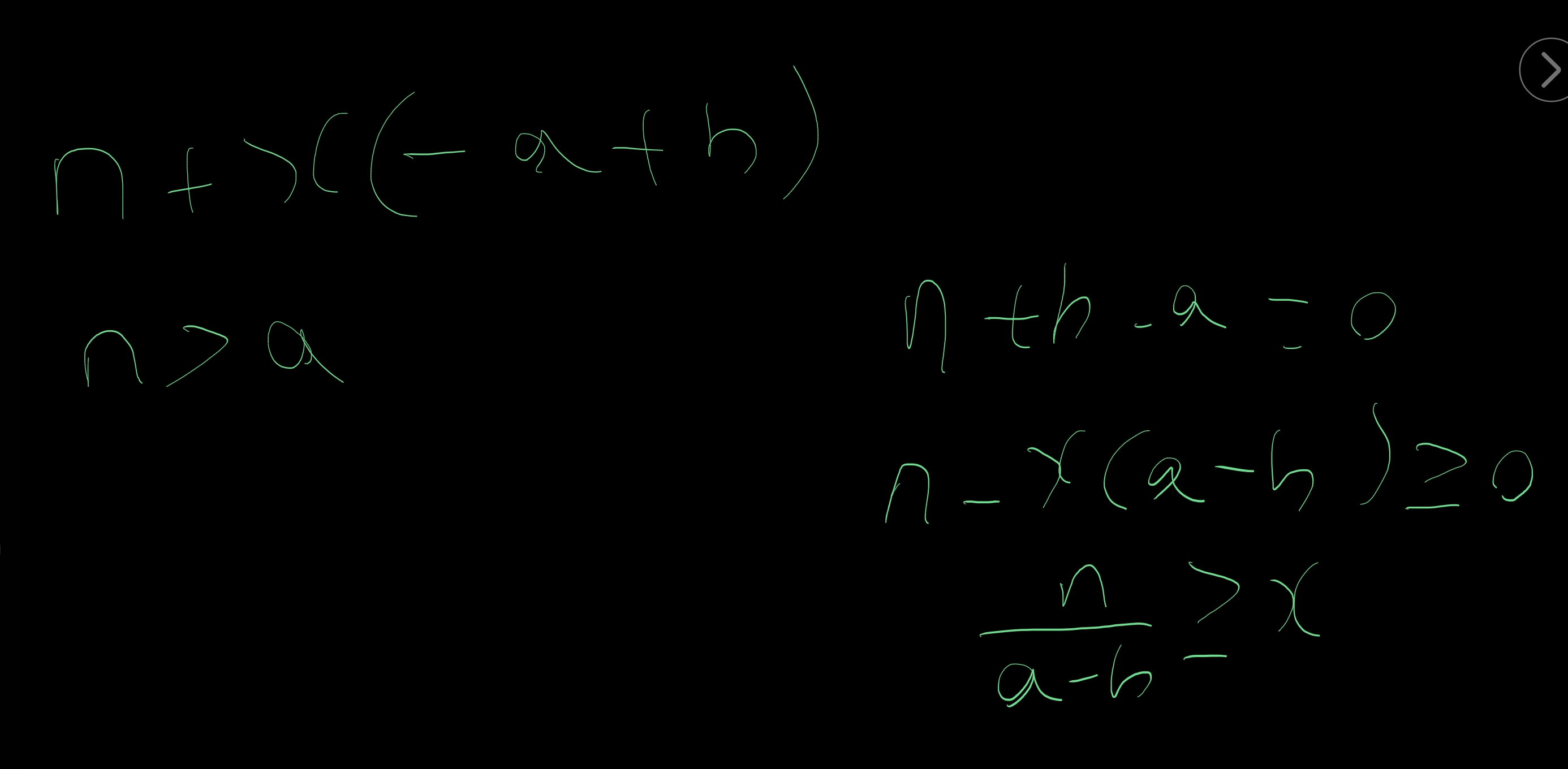 바로 n + x ( -a + b ) >= 0 인 조건을 찾는것이다. 이쁘게 정리하면