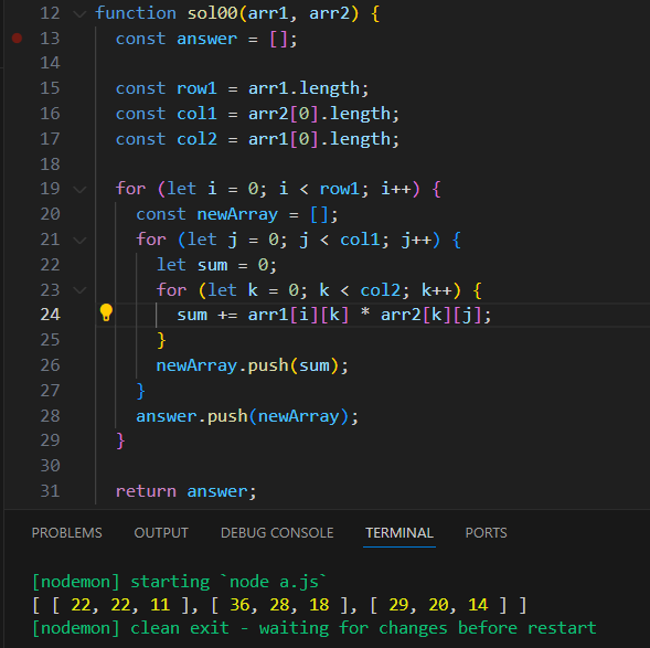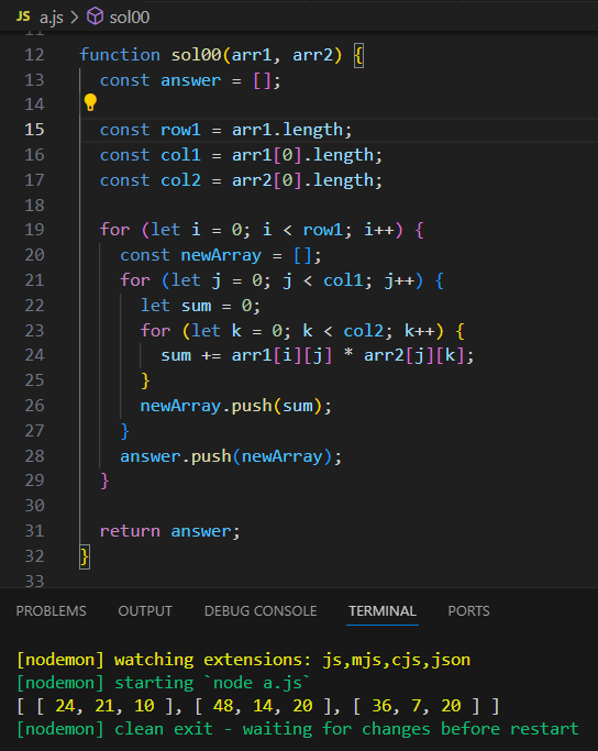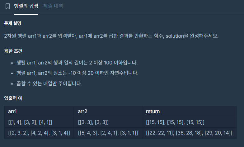arr1의 길이만큼return[i][n]에 arr1[i][j] * arr2[j][k]를 배열로 넣는다arr2의 가로세로를 바꾸면 시간복잡도가 한 차원 내려가지 않을까 생각했는데 결국 계산은 똑같이 하기때문에 의미가 없었다.