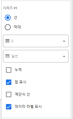 각각의 그래프를 '시리즈' 라고 하며, 아래 사진처럼 여러 설정을 간단히 체크해줄 수 있음 (세부 측정 기준을 추가하여 그래프가 추가되면 시리즈도 그만큼 추가됨. 각각의 시리즈를 설정해주어야 함)