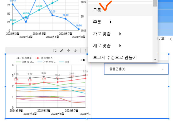 목록과 원하는 차트를 (Ctrl키로) 함께 선택 > 마우스 오른쪽 클릭 > 그룹 선택 하면 됨!