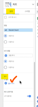 원하는 차트 선택 > 속성 패널의 '설정' 탭에서 아래로 내려 '필터 추가' 버튼 클릭하기