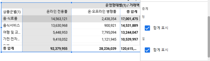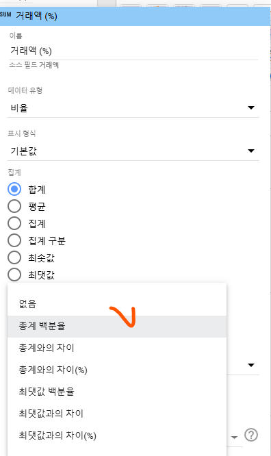 비교 계산 드롭다운하여 원하는 계산 방식 선택, 여기선 비율을 보여주기 위해 총계 백분율 선택함