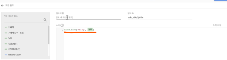사진이 좀 흐리지만, '수식' 필드에 'PARSE_DATE(내 데이터의 날짜 형식, source)' 를 써주면 됨! 저장 -> 완료 누르기