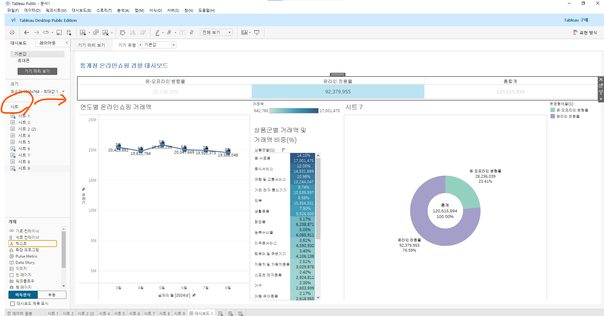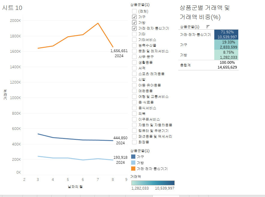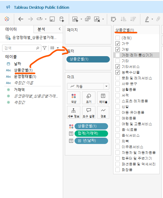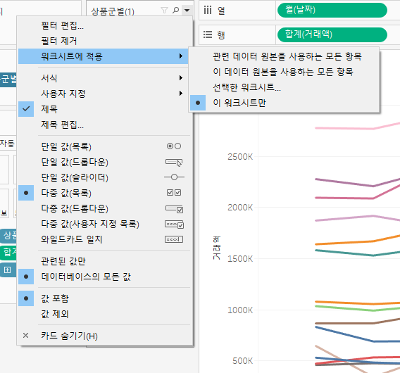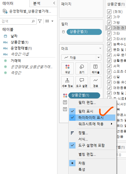 상품군별 우측의 세모 선택 -> 워크시트에 적용 선택 -> 이 데이터의 원본을 사용하는 모든 항목 선택 = 대시보드에도 필터 반영됨!