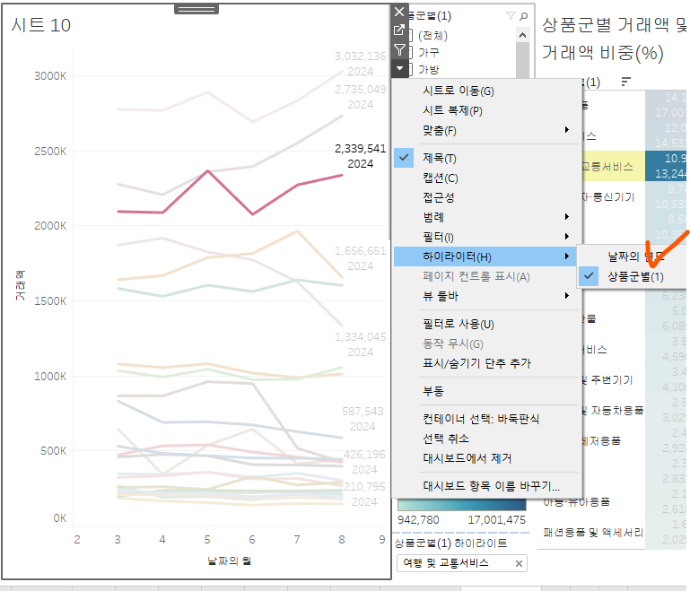 대시보드로 돌아와서, 원하는 시트 마우스로 선택 후 > 해당 시트 오른쪽 메뉴 하단의 화살표 클릭 > 하이라이터 선택 > 방금 하이라이터 만든 필트 선택하기