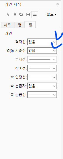 시트/행/열 중 열 클릭 > 격자선, 영 기준선 '없음' 선택