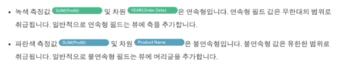 Tableau는 불연속형 필드는 파란색, 연속형 필드는 녹색으로 나타내줌.