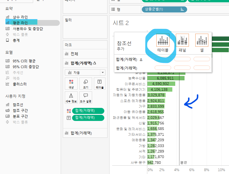 분석 패널에서, 평균 라인을 드래그하여 뷰에 가져다놓으면 사진처럼 평균선이 표시됨
