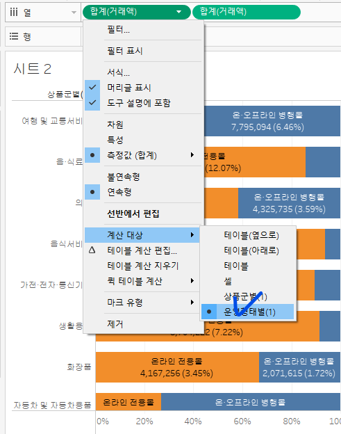 필드를 선반에 올리지 않고, 열/행 선반에서 직접 값을 계산할 수 있는 방법
