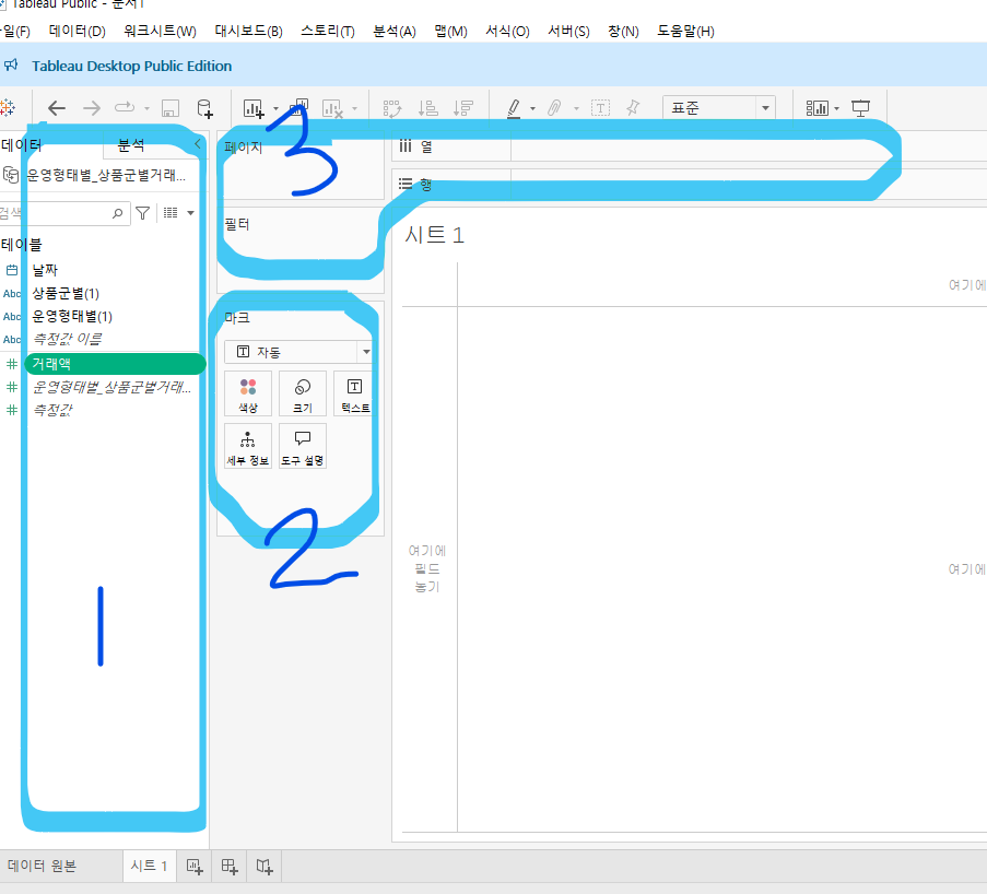 아래처럼 열과 행이라는 선반에 원하는 컬럼을 넣으면, 하단 시트(뷰)에 그래프가 나타남