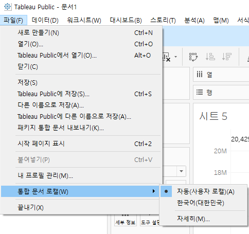 Tableau 상단의 파일 > 통합 문서 로캘 > 자세히 ... 클릭 > 영어 선택 후 확인