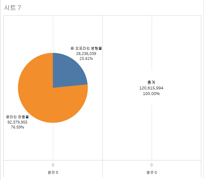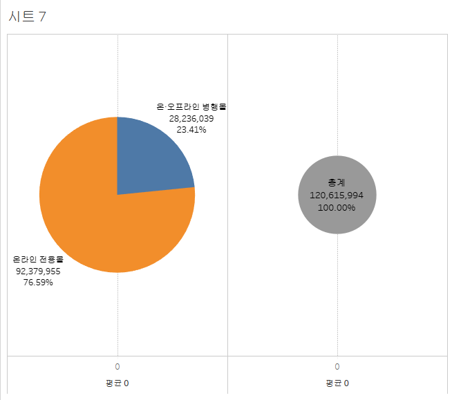 열 선반에 '0'이라는 값(아무거나 넣은거긴 함)을 넣어 차트를 둘로 나눈 후, 아래 사진처럼 각각 만들어주기 (왼쪽: 파이차트, 오른쪽: 도형(원))