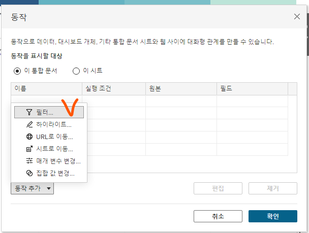 새롭게 창이 뜰 텐데, 동작 추가 클릭하면 추가할 수 있는 동작 리스트가 표시됨