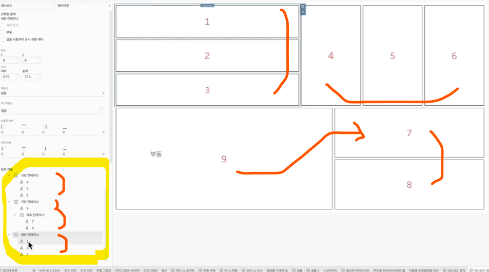 바둑판식: tableau에서 기본적으로 세팅되는 대시보드 설정. 말그대로 시트가 바둑판 형식으로 겹치지 않게 배치됨