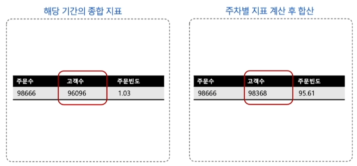 종합 지표와 주차별 집계 후 합산한 지표 값이 다른 이유는?