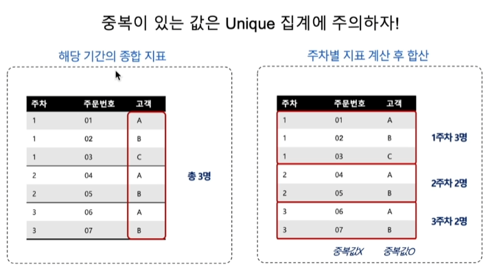 주차별로 쪼개어 보면 첫째주=1명, 둘째주=1명, 총합=1+1=2명으로 중복되어 합산되기 때문!!!