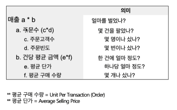 예를 들어서, 이커머스의 매출은 (간단히 말해서) 주문 건수 * 건당 주문 금액이 됨