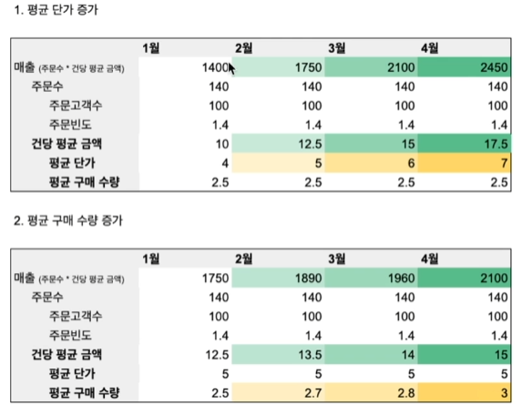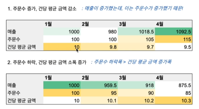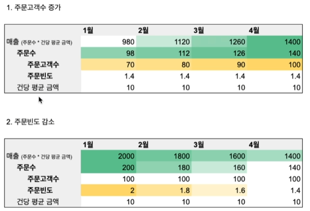 1번에서는 건당 평균 금액을 어떻게 높일 수 있을지, 2번에서는 주문수를 어떻게 늘릴 수 있을지를 고민해야 함